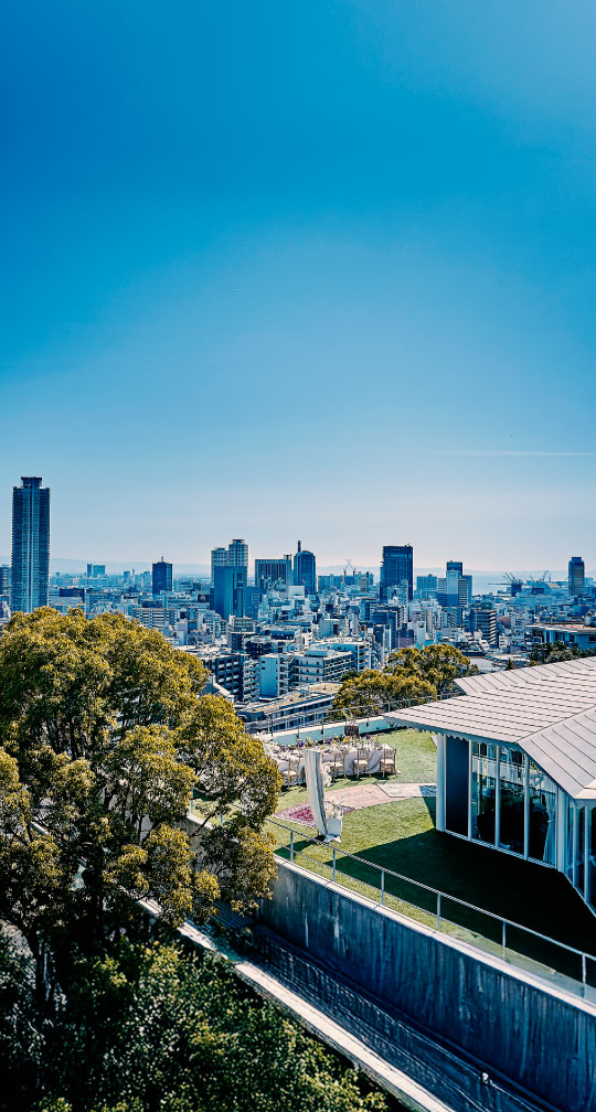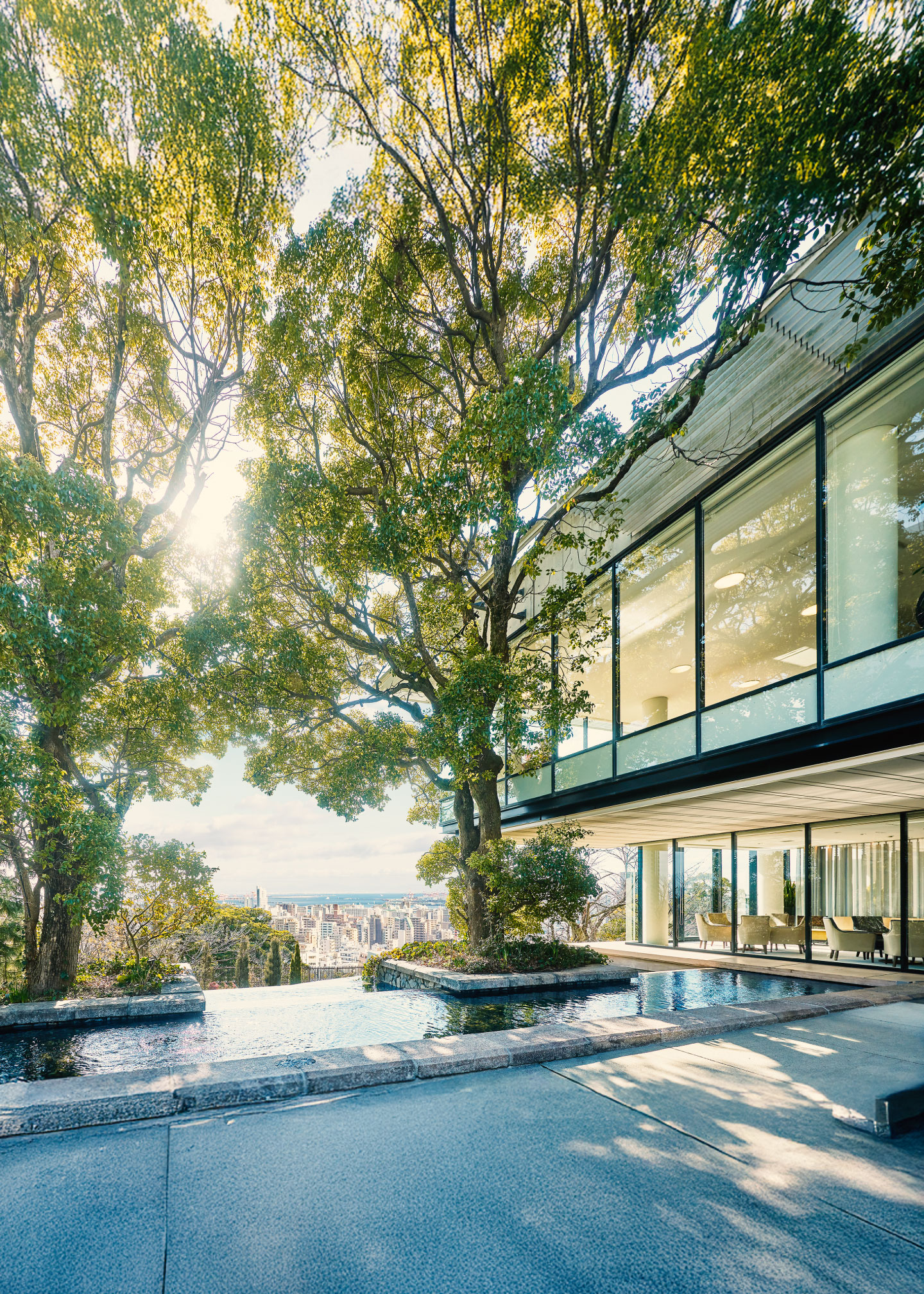 抜けるような青空、陽光を受けてきらめく緑、頬をなでる風、市街地と海が一体となった神戸らしい眺望。SOLAは、三宮駅からタクシーで5分の好立地でありながら、街の中では感じることのできない静けさと開放感が広がり、訪れた人をたちまち非日常の世界へと誘います。